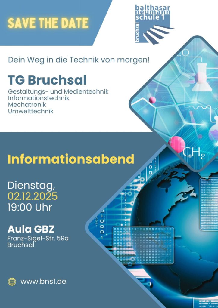 Was gibt es an unserem Technischen Gymnasium alles zu entdecken? Das erfährst du beim Infoabend an der Balthasar-Neumann-Schule 1 in Bruchsal.