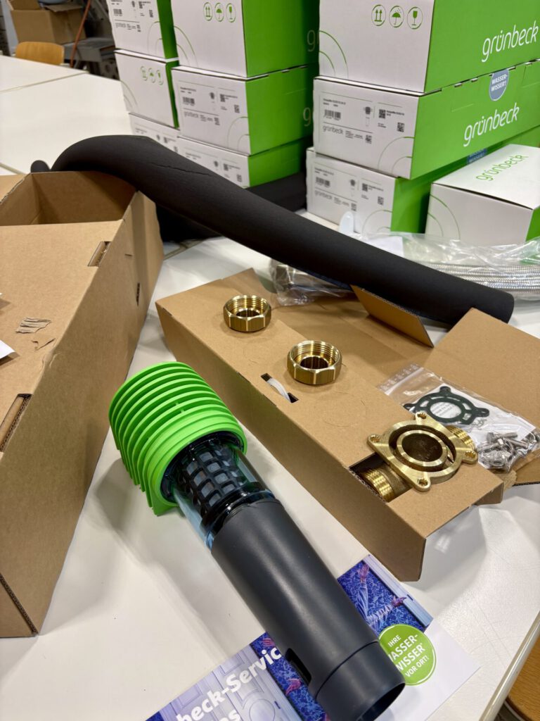 Danke der Spende steht unseren Klassen echte Anlagentechnik zur Verfügung, wie sie auch im Handwerk verbaut wird. Während eine Wasserenthärtungsanlage Kalk im Wasser per Ionenaustausch reduziert und so Leitungen, Armaturen und Geräte schützt, halten die Filter Partikel wie Sand und Rost aus der Trinkwasserinstallation fern und lassen sich einfach per Rückspülung reinigen – inzwischen sind sie Standard bei einer Trinkwasserinstallation.
